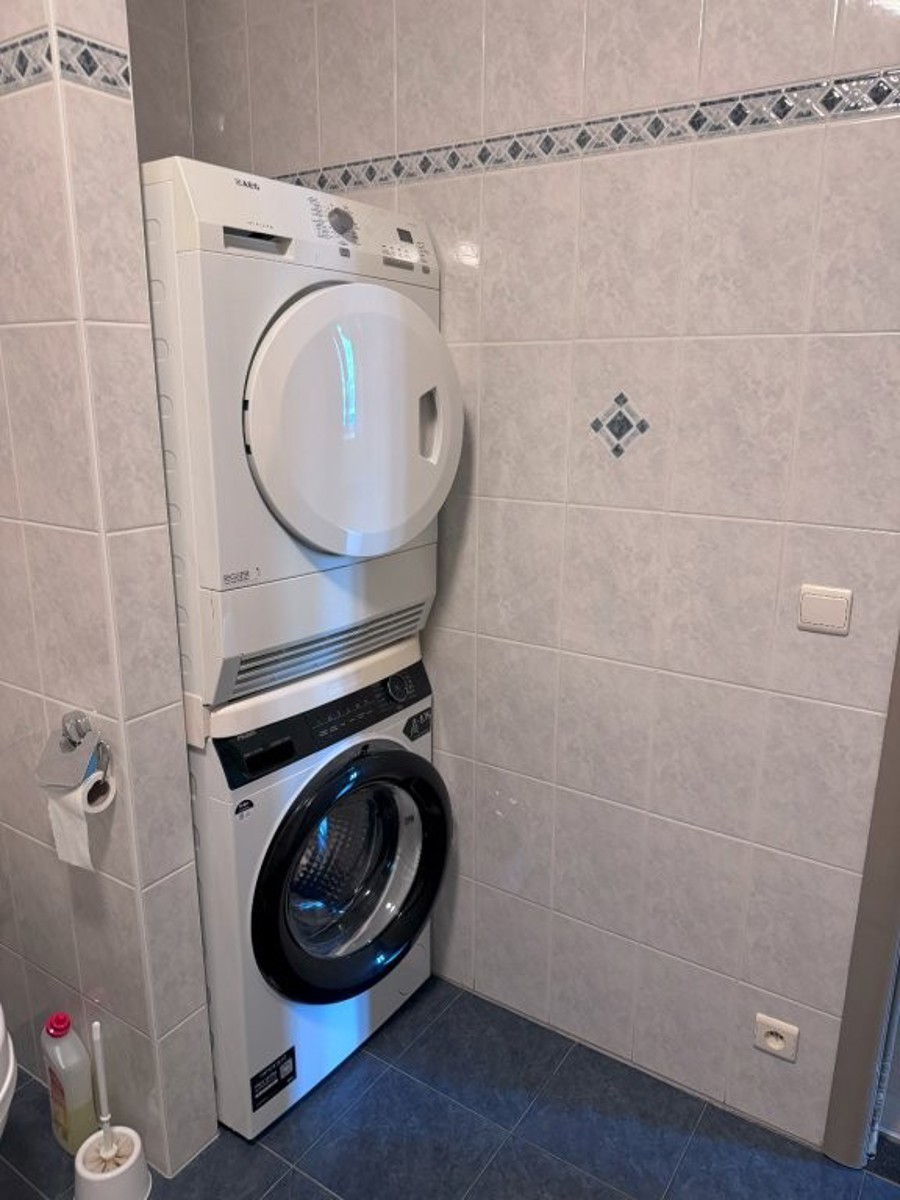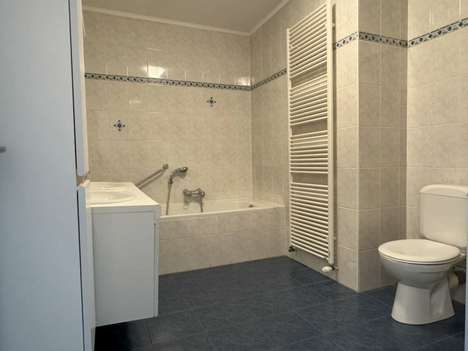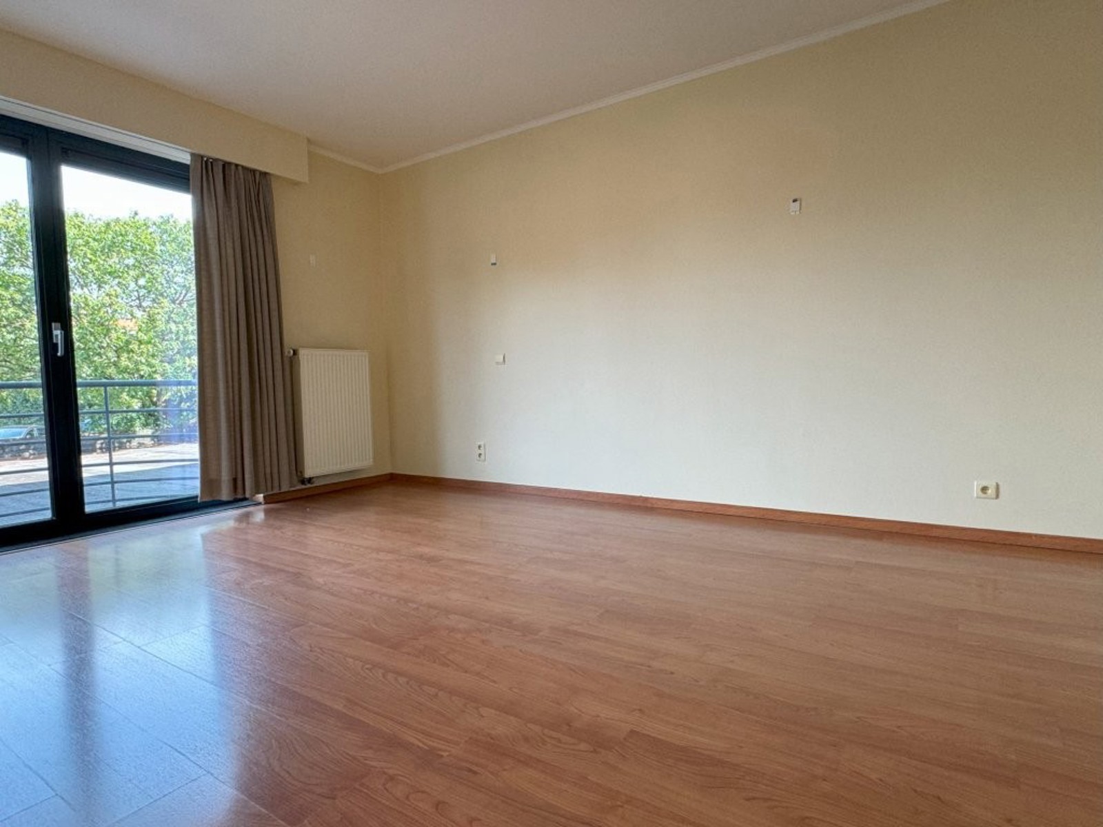 Dit mooi gelegen ruim appartement op de 1e verdieping beschikt over een inkomhal met vestiaire en gastentoilet, een heel ruime en lichtrijke woonkamer die toegang biedt tot het zuidgericht terras, een open ingerichte keuken (frigo met vriesvak, dubbele spoelbak, kookvuur, dampkap, oven, vaatwasmachine), 2 grote slaapkamers (15m² en 13m²), een dressing/berging (6,50m²) en een badkamer met dubbele lavabo, een 2e toilet, een ligbad en plaats voor wasmachine en droogkast.
